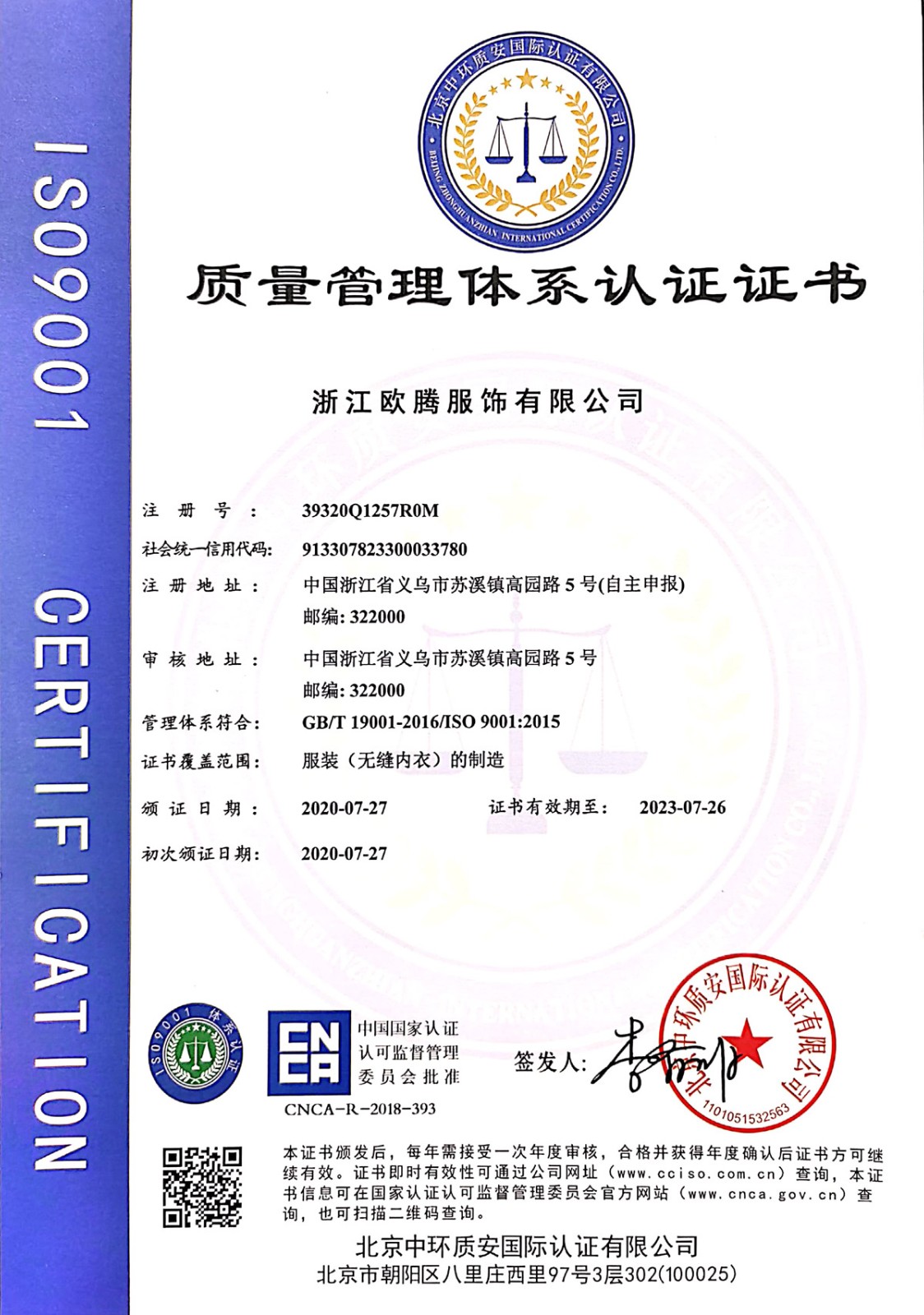 浙江歐騰服飾有限公司位于世界小商品之都-義烏。創立于2015年,是一家專業生產無縫針織運動服飾和內衣的工貿一體企業,擁有自主出口權。 工廠的占地面積約16000平方米 ,引進了大型圣東尼、高騰等多種先進的制衣設備300余臺。月產能可達90萬件。 歐騰服飾每年投入近百萬資金打樣開發新產品,有著一支高素質設計、技術員工隊伍。工廠先后通過了ISO 9001質量管理體系認證、BSCI認證、GRS認證、OEKO-TEX國際生態紡織品認證等多項專利檢測報告。可提供OEM&ODM服務。歐騰服飾以一套完整、科學的質量管理體系,生產的服裝從原材料紗線到成衣,質量完全能夠滿足國內、國際質量要求。獲得了客戶一致好評。工廠先后獲得省科技型企業、國家高新企業、義烏市誠信講信用單位、規上企業、信用AAA級等榮譽。